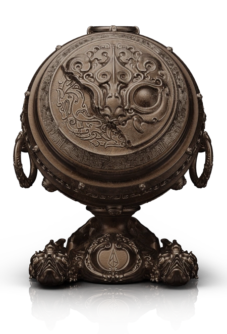 这个笔座设计的灵感来源来自中国传统文化的多个经典:整体上来说,主体是一个中国大鼓的造型,鼓面是兽面纹浮雕,下方则露出汉代龙纹。鼓身刻有战国时期金错银的纹样;下方基座是两条出没波涛的唐龙,波涛在后方相聚,把一座山峰环绕。